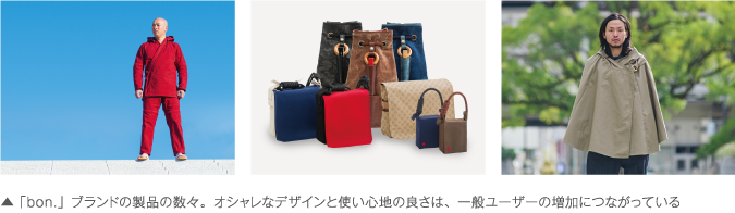 2011 年5月、ひろしま産業振興 機構の助成を受けて、僧侶向けの商品や法衣再生を手がける「bon.(ぼん)」ブランドを