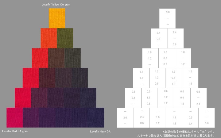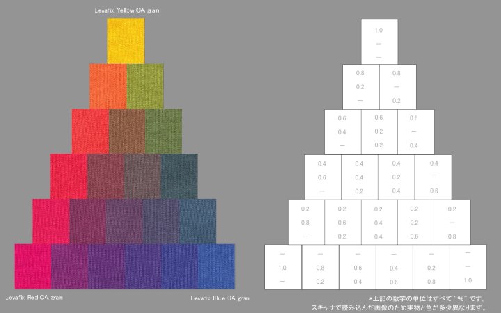 色のピラミッドの画像をクリックすると染料の三原色の配合の量も表示されます。